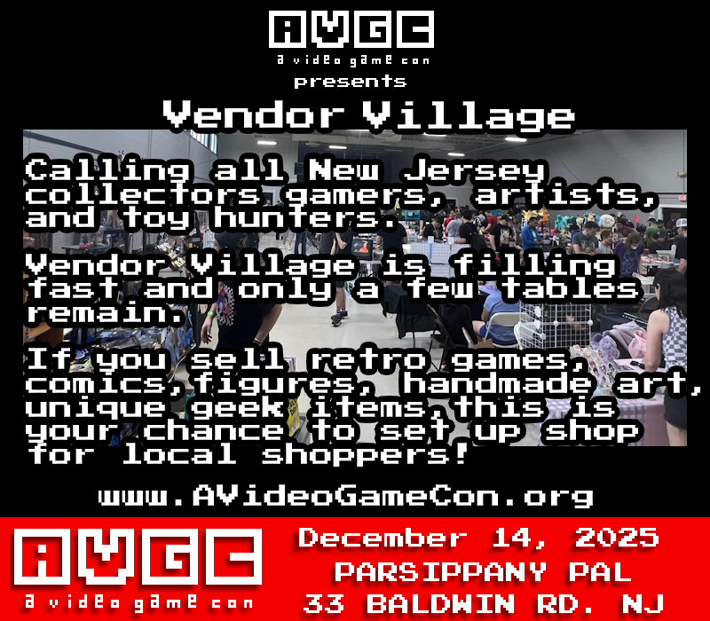 AVGC: Vendor Village returns this December 14 for a one-day show! Explore a wide variety of video game merchants, passionate collectors, and talented indie artists all under one roof. Whether you’re a seasoned collector, a hobbyist looking to expand your library, or a newcomer curious to see what the community has to offer, Vendor Village is the perfect place to buy, trade, and discover exciting new items.